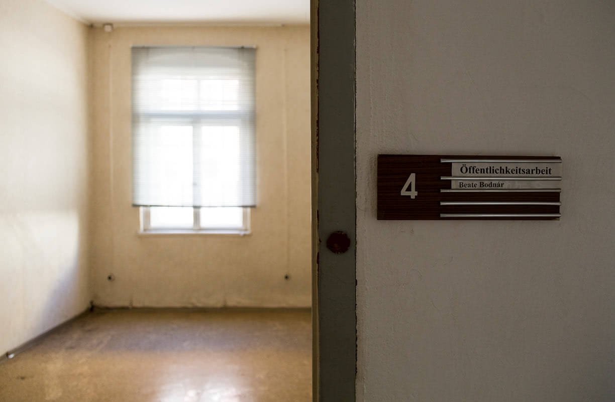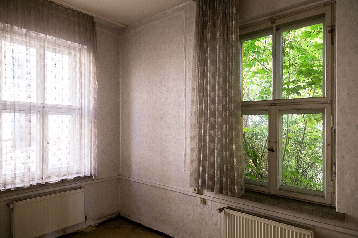 Der Raum: Versprüht noch ein bisschen DDR-Flair, die Tapete blättert, die Gardinen hängen noch. Dafür hat man aber einen fantastischen Ausblick auf den Sonnenberg – und bis zu 240 qm Gestaltungsfreiraum.